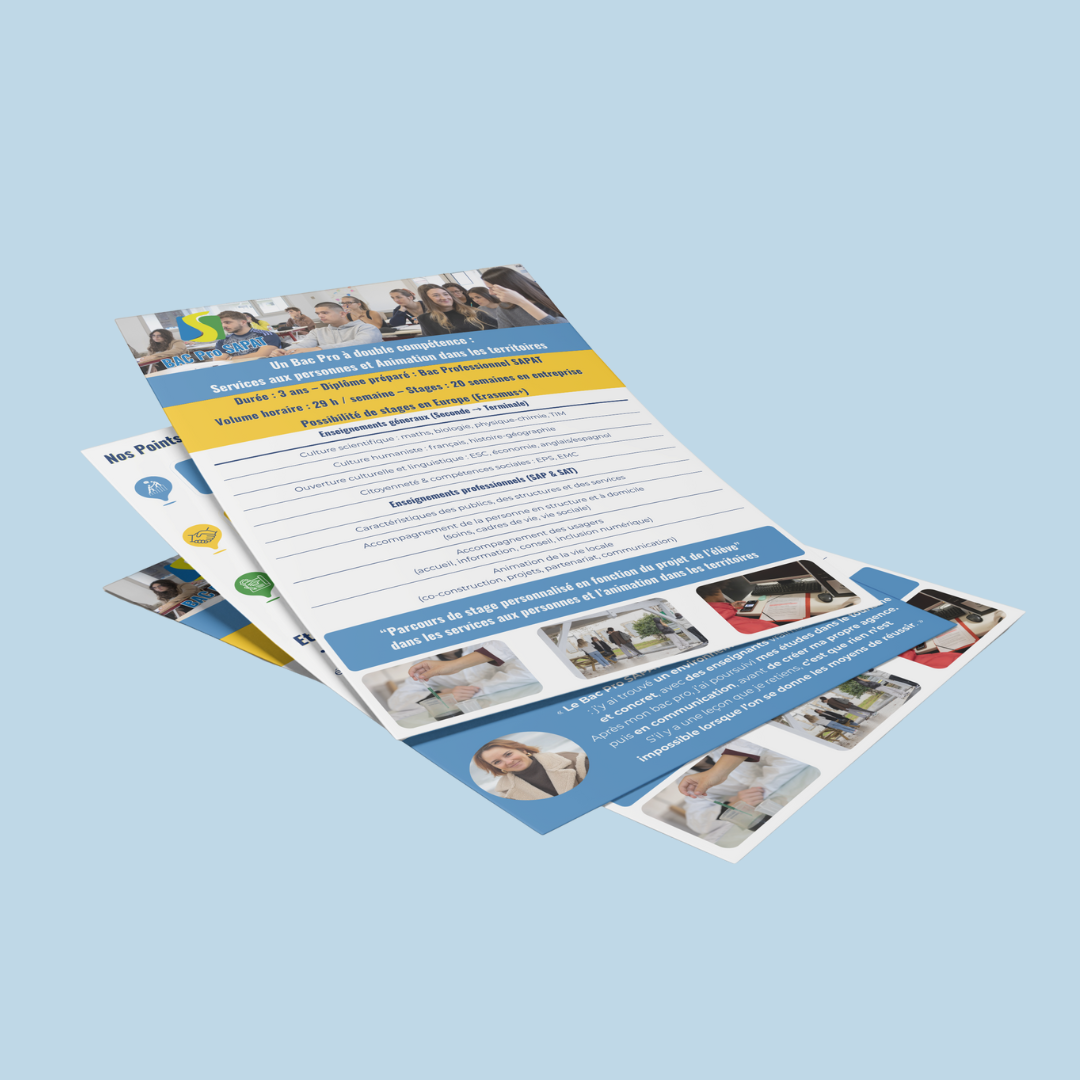 Dans un second temps, j’ai conçu et décliné différents supports de communication , chemises à rabats, plaquettes de formation, Roll-up et livrets interactifs pensés pour être utilisés lors des événements (salons, portes ouvertes) mais également diffusés auprès d’autres collèges et lycées partenaires.
